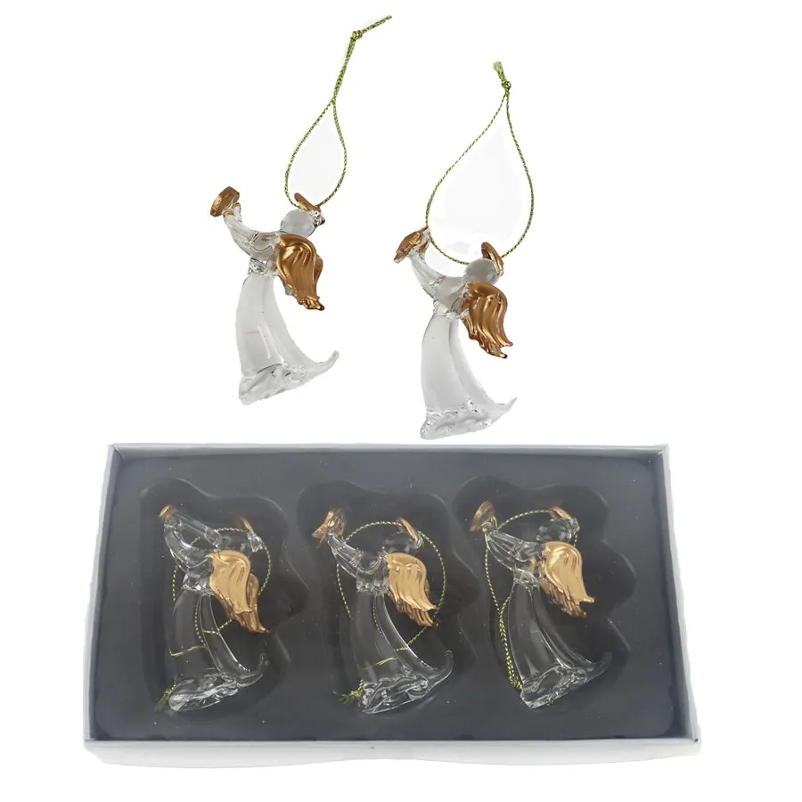 Set of decorative angels for hanging. Set contains 3 angels. Dimensions : 3 x 3 cm, height 6,5 cm. Colour : clear glass, gold. Material : glass.