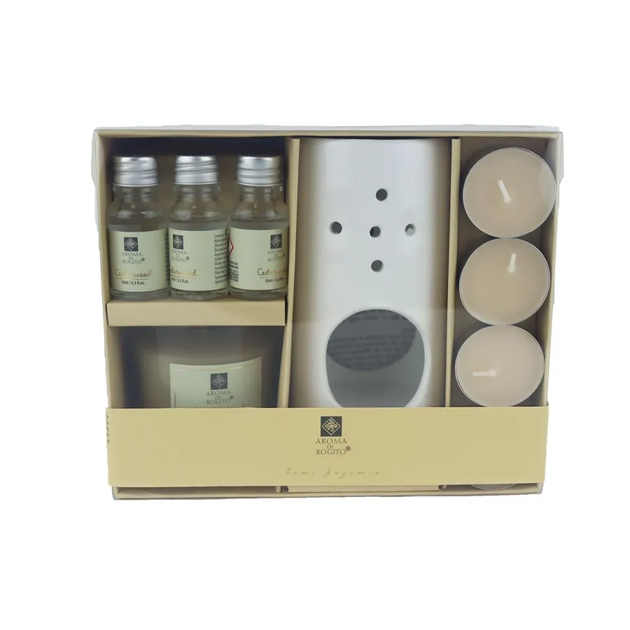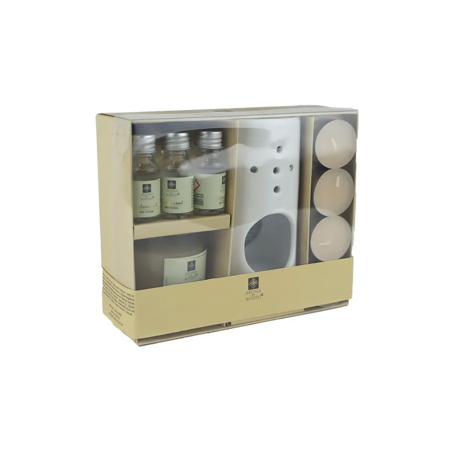 The gift set includes an aroma lamp, 3 oils, 1 scented candle and 4 scented tea candles.