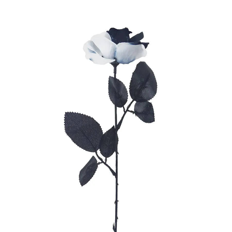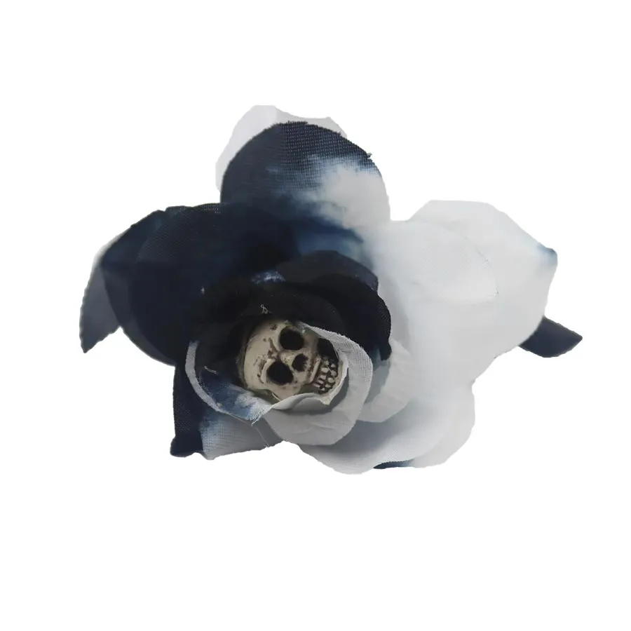 Artificial black and white rose with a small skull in the center. Perfect for spooky decoration.