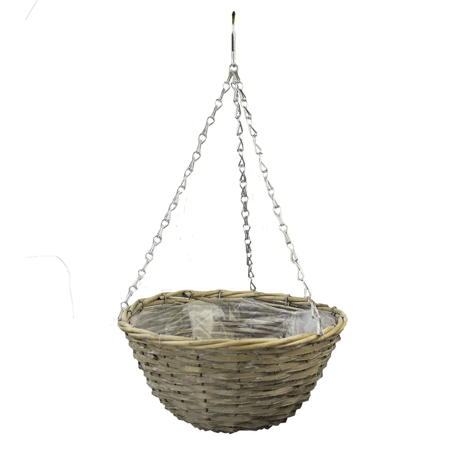 Hanging flower pot with plastic The flower pot has a diameter 32 cm, a height 16 cm. Grey color. Material: wicker, plastic.