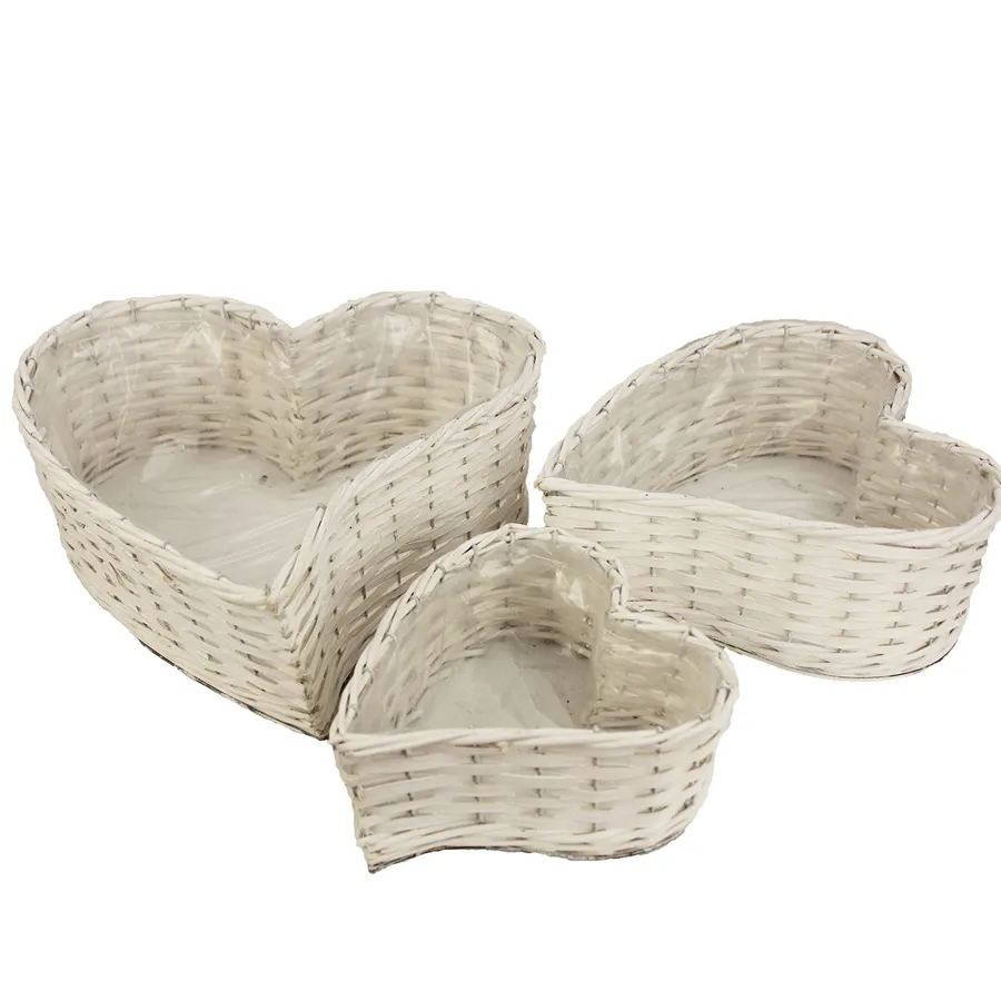 Heart shaped flower pots. Set contains 3 pcs. Size: Small: 22,5 x 22,5 cm, height 8,5 cm. Medium: 29 x 31 cm, height 10,5 cm. Large: 36 x 40 cm, height 12,5 cm. Color: white. Material: wicker, plastic.