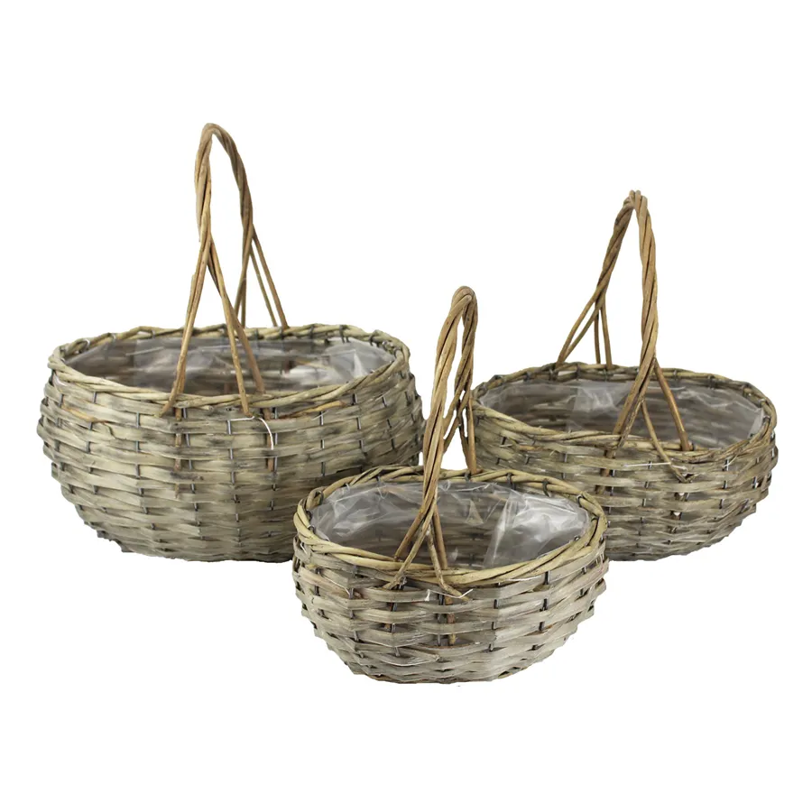 Set of 3 pcs. Size of the baskets: Small: 20 x 16 cm. The height with handle is 25 cm (without 10 cm). Medium: 24 x 20 cm. The height with handle is 30 cm (without 12 cm). Large: 28 x 26 cm. The height with handle is 30 cm (without 14 cm). Dimensions: Please note all dimensions are approximate, the baskets are all handmade and therefore unique. The dimensions given are an indication of the approximate size, also the color may little vary slightly. Variance of size +-2 cm.