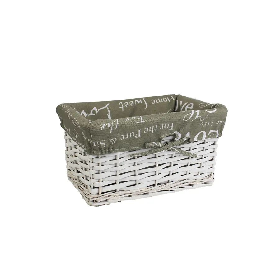 Beautiful wicker storage box with lid - smallest. Size: 34 x 23 cm, height 18 cm Color: white, fabric - grey Material: wicker, fabric