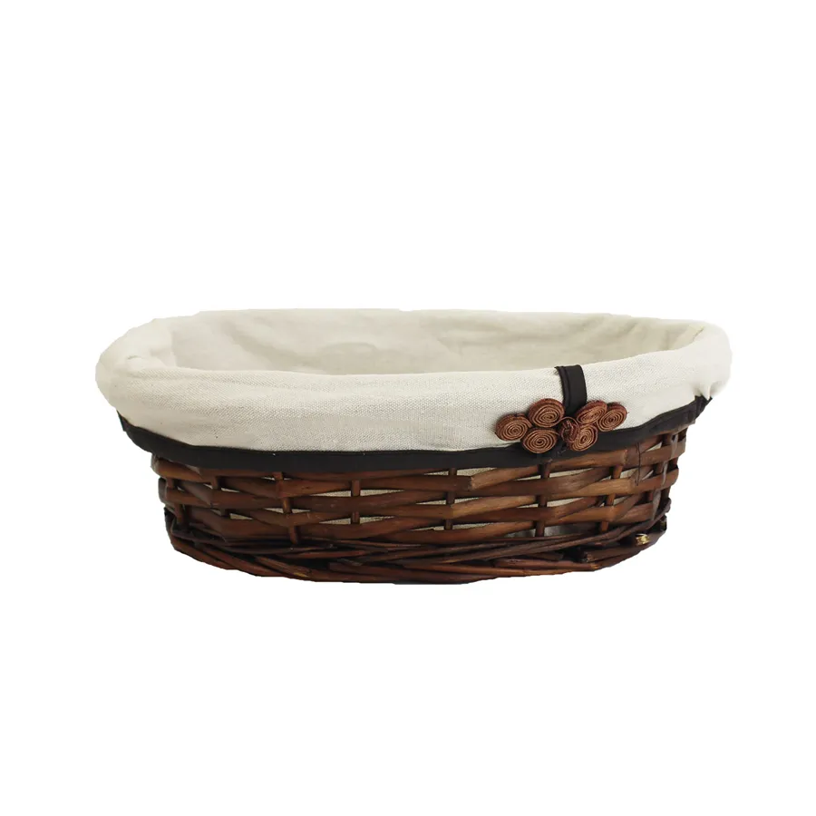 Beautiful basket with fabric - oval. Size: 30 x 20 cm, height 10 cm Color: brown, fabric - white Material: wicker, fabric