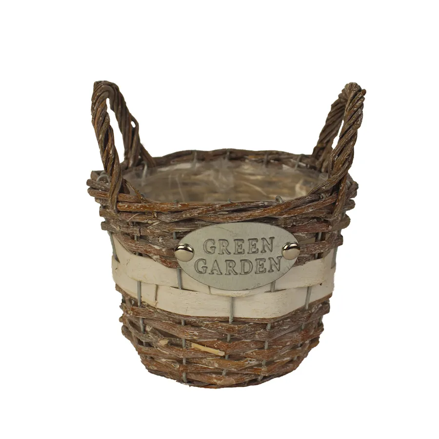 Wicker flower pot with plastic foil. Size: dia 15 cm, height 12 cm, total height with handles 16 cm. Color: combination brown-white. Material: wicker, plastic.