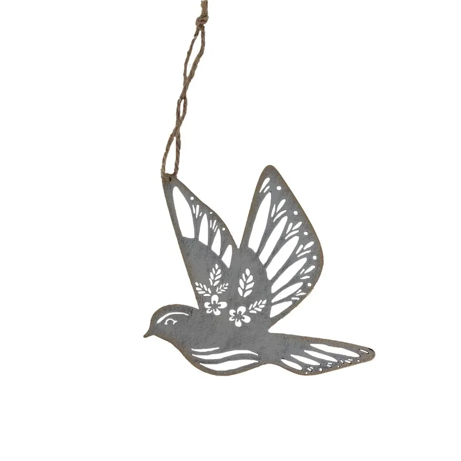 Decorative bird for hanging. Dimensions: 11 x 15 cm, thickness 0.1 cm. Color: a combination of gray and rust. Material: metal.