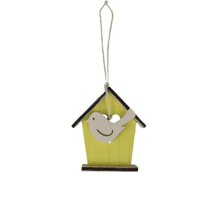 Decorative booth for hanging. Dimensions: 8.5 x 1.8 cm, height 9 cm, total length 17 cm. Color: combination of yellow, white, natural. Wood-based material.