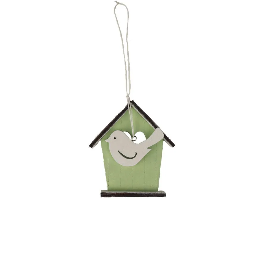 Decorative booth for hanging. Dimensions: 8.5 x 1.8 cm, height 9 cm, total length 17 cm. Color: combination green, white, natural. Wood-based material.