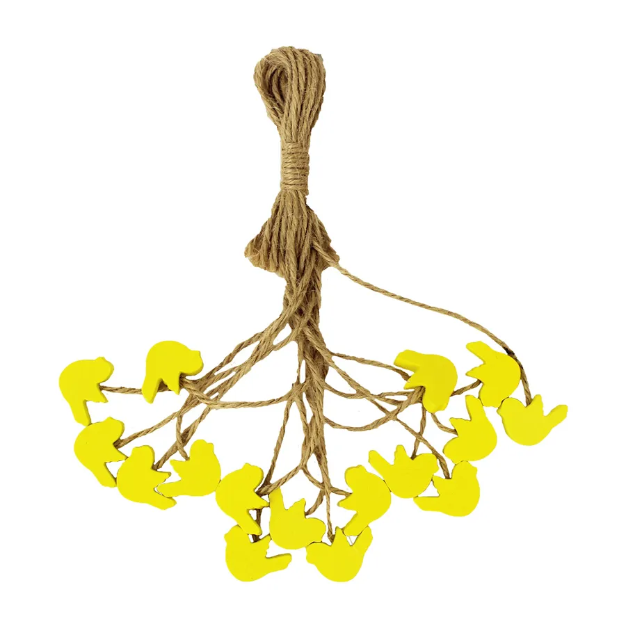 Decorative birds in a bundle. The bundle contains 16 birds. Dimensions: 3 x 3 cm, total length with string 20 cm. Yellow color. Material: wood.