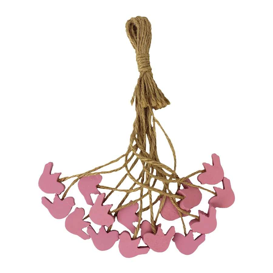 Decorative birds in a bundle. The bundle contains 16 birds. Dimensions: 3 x 3 cm, total length with string 20 cm. Color: pink. Material: wood.