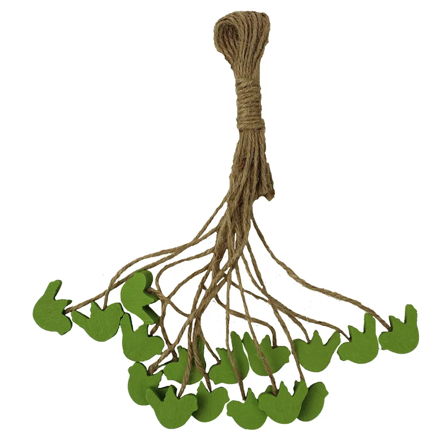 Decorative birds in a bundle. The bundle contains 16 birds. Dimensions: 3 x 3 cm, total length with string 20 cm. Color: green. Material: wood.