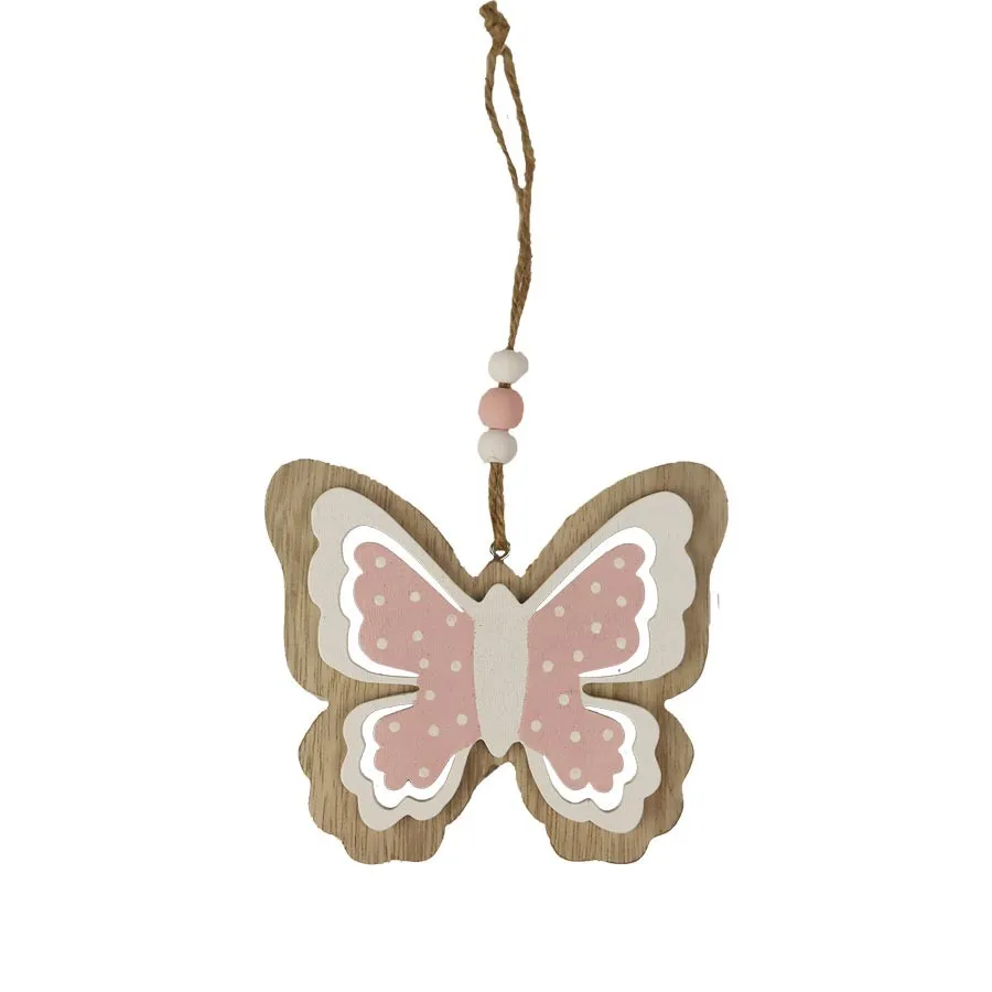Decorative butterfly for hanging. Dimensions: 12 x 1.2 cm, height 10.5 cm, total length 23 cm. Color: combination of natural, pink, white. Wood-based material.