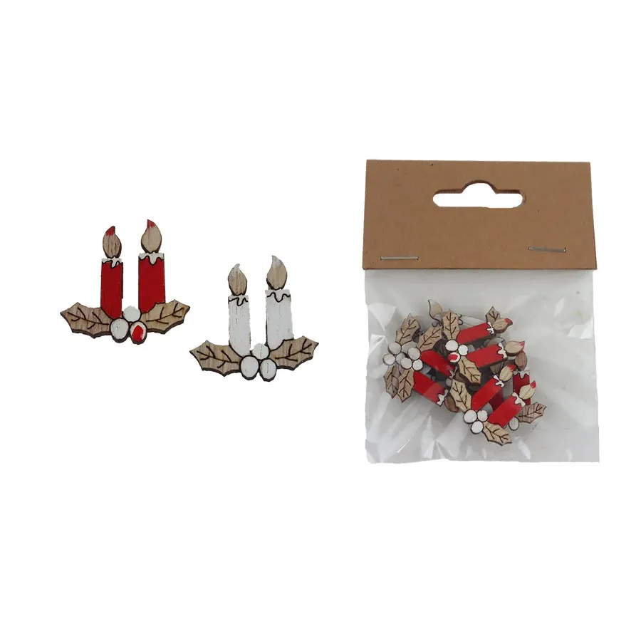 Set of candle -shaped decorations. The set contains 8 decorations. Dimensions: Color: Combination brown, white, red. Wood -based material.