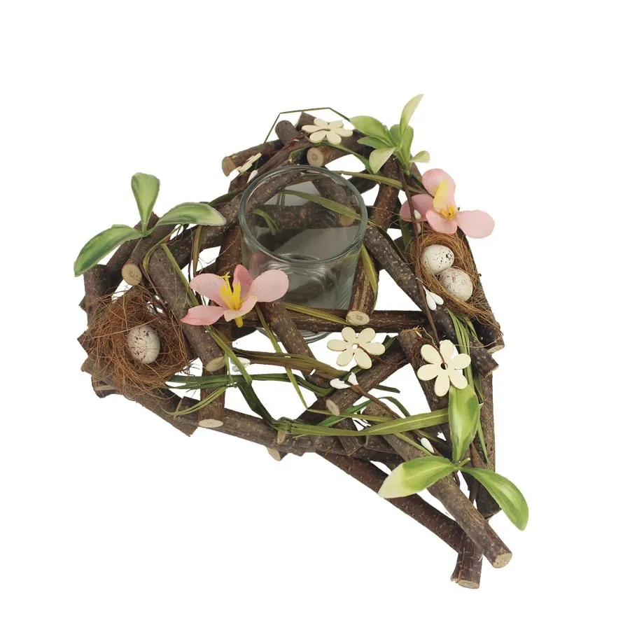 Color: combinaiton of brown, white, pink and green. Material: natural, glass, decorations - plastic, textile.