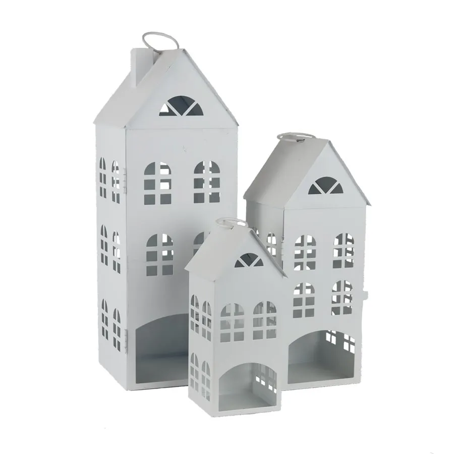 Set of decorative candle houses. The set contains 3 houses of three sizes. The small house has dimensions: 7.5 x 8 cm, height 21.5 cm. The middle house has dimensions: 10.5 x 10.5 cm, height 29 cm. The large house has dimensions: 12.5 x 13 cm, height 38 cm.