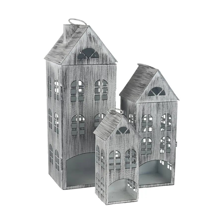 Set of decorative candle houses. The set contains 3 houses of three sizes. The small house has dimensions: 7.5 x 8 cm, height 21.5 cm. The middle house has dimensions: 10.5 x 10.5 cm, height 29 cm. The large house has dimensions: 12.5 x 13 cm, height 38 cm.