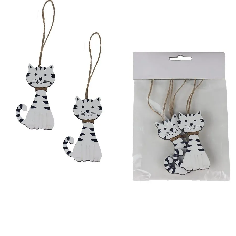 Set of decorative cats for hanging. Set includes 3 cats. Dimensions: 4.5 x 7.5 cm, thickness 0.4 cm. Color: combination of white and black. Wood-based material.