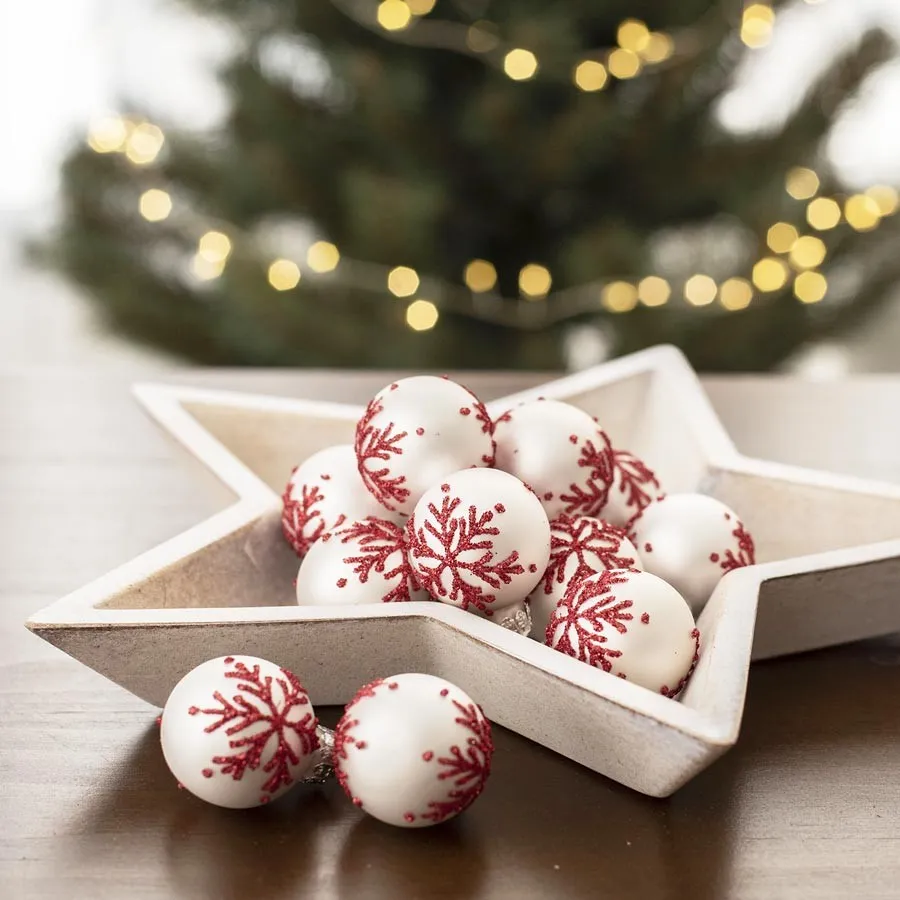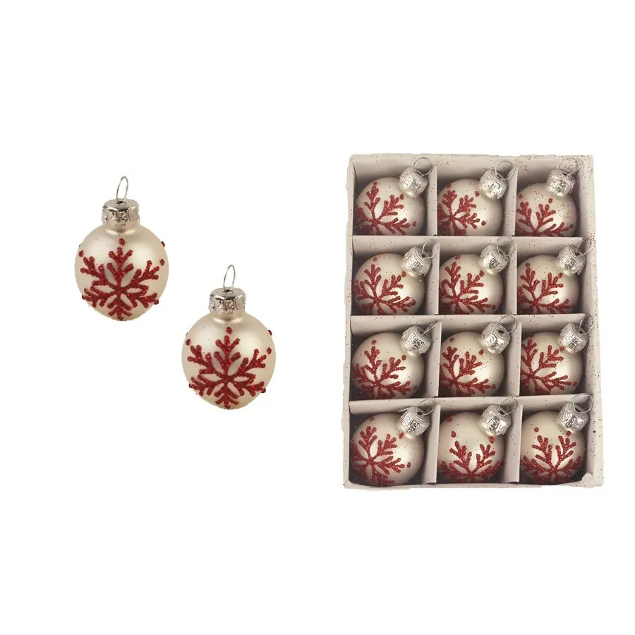 Set of Christmas decorations to hang.The set contains 12 ornaments.Dimensions: diameter 3 cm, height 3.5 cm.Color: combination of white and red.Material: glass.