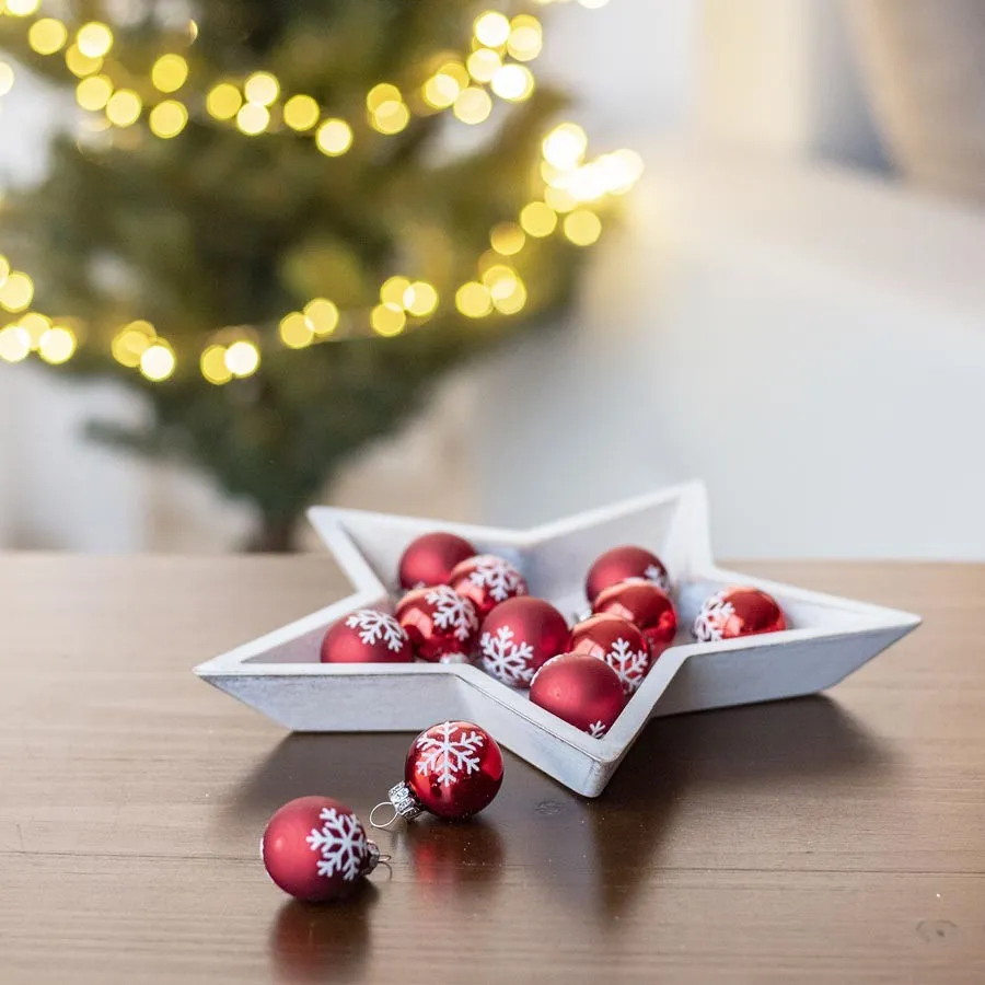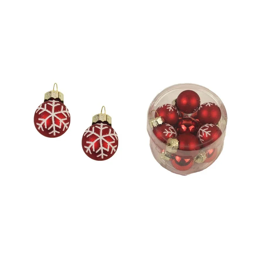 Set of Christmas decorations to hang.The set contains 12 ornaments.Dimensions: diameter 2 cm, height 2.5 cm.Color: a combination of red and white.Material: glass.