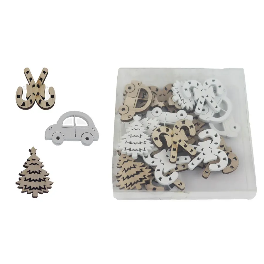 Set of decorative decoration mix. The set contains 24 decorations. Dimensions: Color: Combination brown, white. Wood -based material.