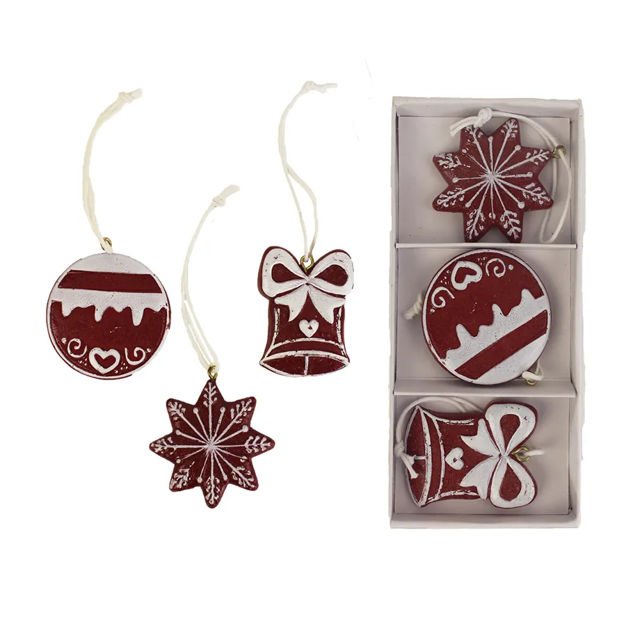 Set contains 3 pcs. Ball - diameter 4.6 cm, thickness 0.5 cm. Star - diameter 4.5 cm, thickness 0.5 cm. Bell - width 3.7 cm, thickness 0.5 cm, height 5 cm. Color: combination of red and white. Material: polyresin.