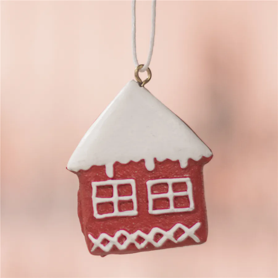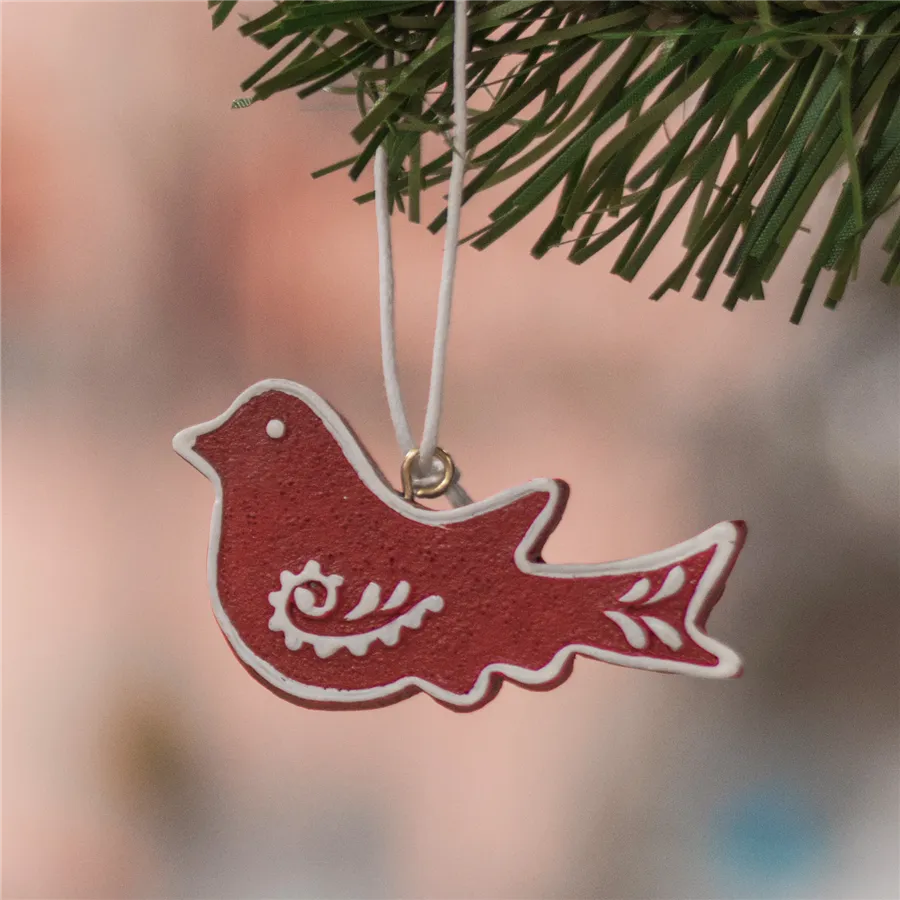 Set contains 3 pcs. Tree- width 3.8 cm, thickness 0.7 cm, height 5 cm. House - width 4 cm, thickness 0.7 cm, height 4.8 cm- Bird - width 6 cm, thickness 0.7 cm, height 3.2 cm. Color: combination of red and white. Material: polyresin.