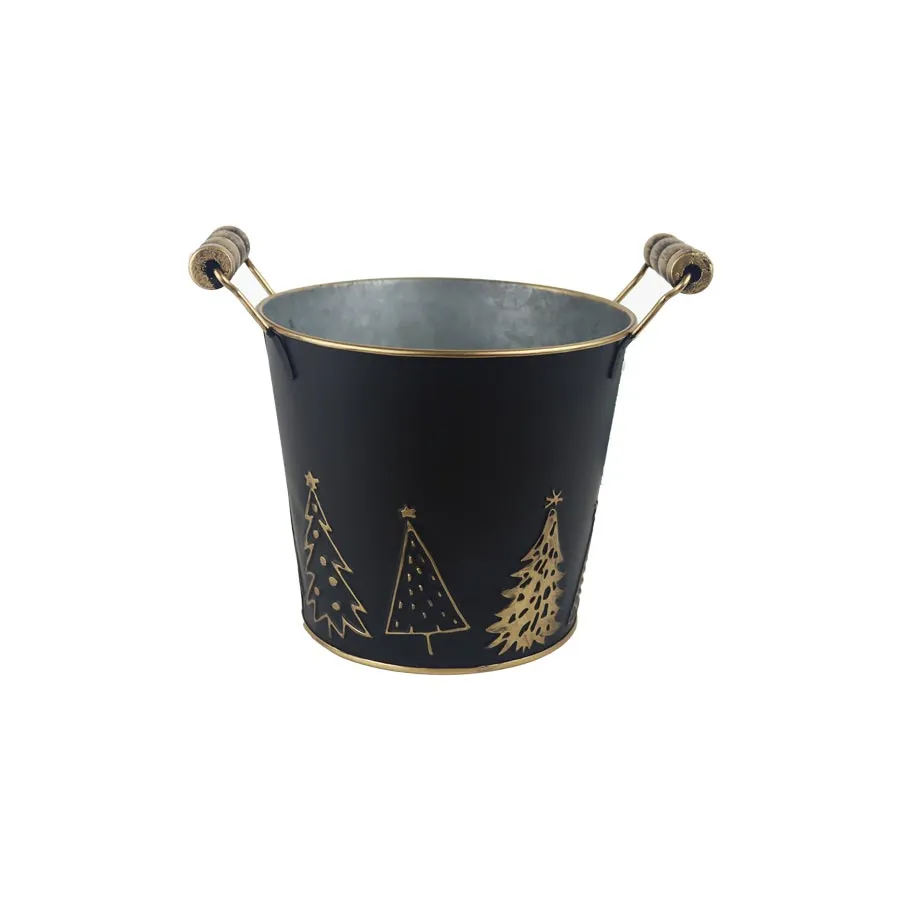 Christmas matel planter. Dimensions : diameter 15 cm, height 13 cm. Colour : combination of black, gold. Material : metal.