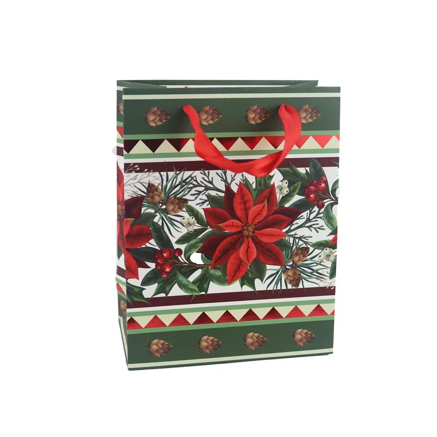 Christmas gift bag. Dimensions : 18 x 10 cm, height 23 cm. Colour : combination of green, red. Material : paper.