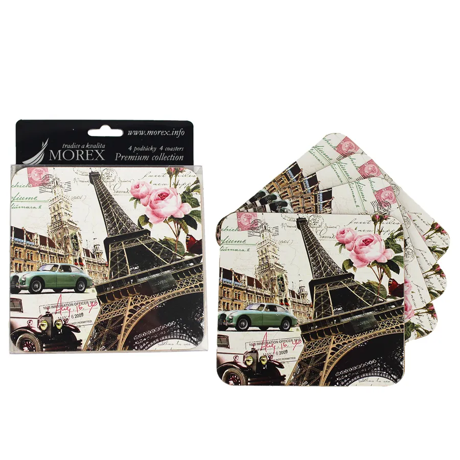 A beautiful set of coasters Eiffelovka 3. The set contains 4 coasters with dimensions of 10 x 10 cm, thickness 0.4 cm. Material: combination: cork, wood, foil. Do not place objects whose temperature is higher than 100°C.