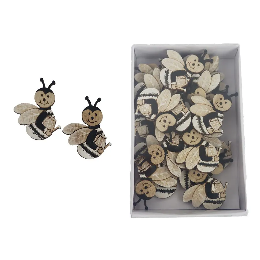 Set of decorative bees. The set contains 24 bees. Dimensions: 2.8 x 0.2 cm, height 3.5 cm. Color: combination of natural, white, black. Wood-based material.