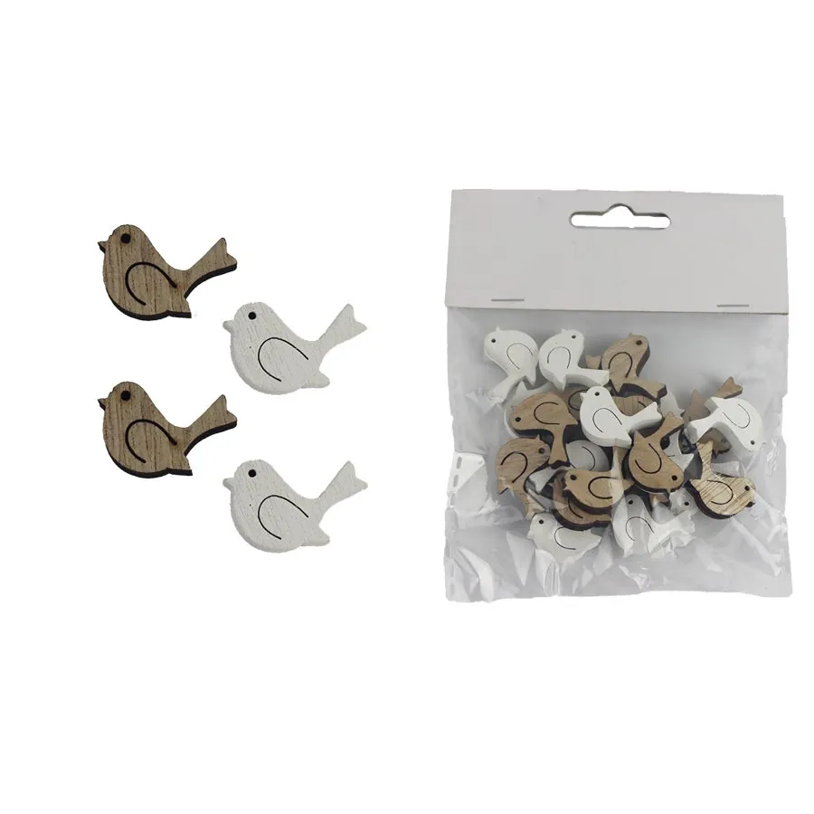 Set of decorative birds. The set contains 24 birds. Dimensions: 2.2 x 0.5 cm, height 1.5 cm. Color: white, natural combination. Wood-based material.