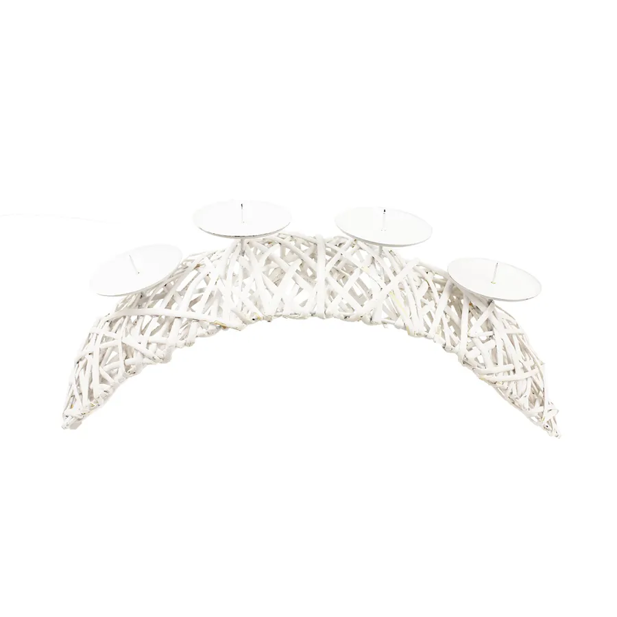 Wicker candle holder for 4 candles. Size: 40 x 15 cm, height 17 cm. Color: white. Material: wicker, sheet metal.