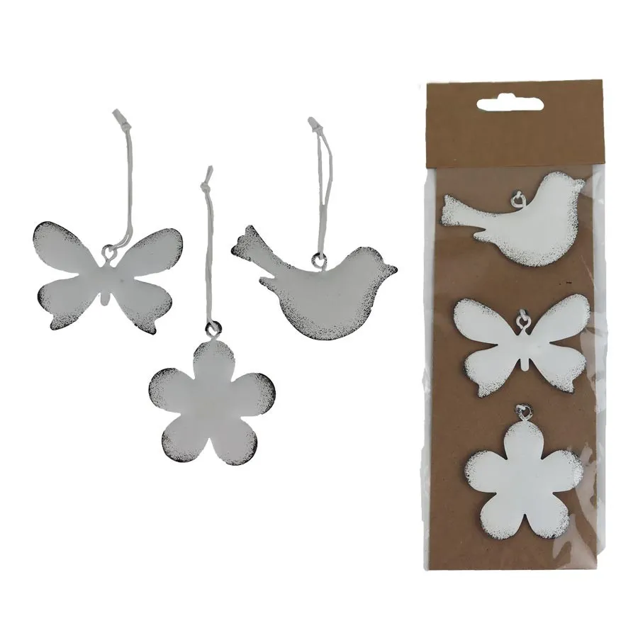 Set of decorations to hang. The set contains 3 decorations. Dimensions: 5 - 6.5 x 0.3 cm, height 4 - 5.7 cm. Color: white patina. Material: metal.