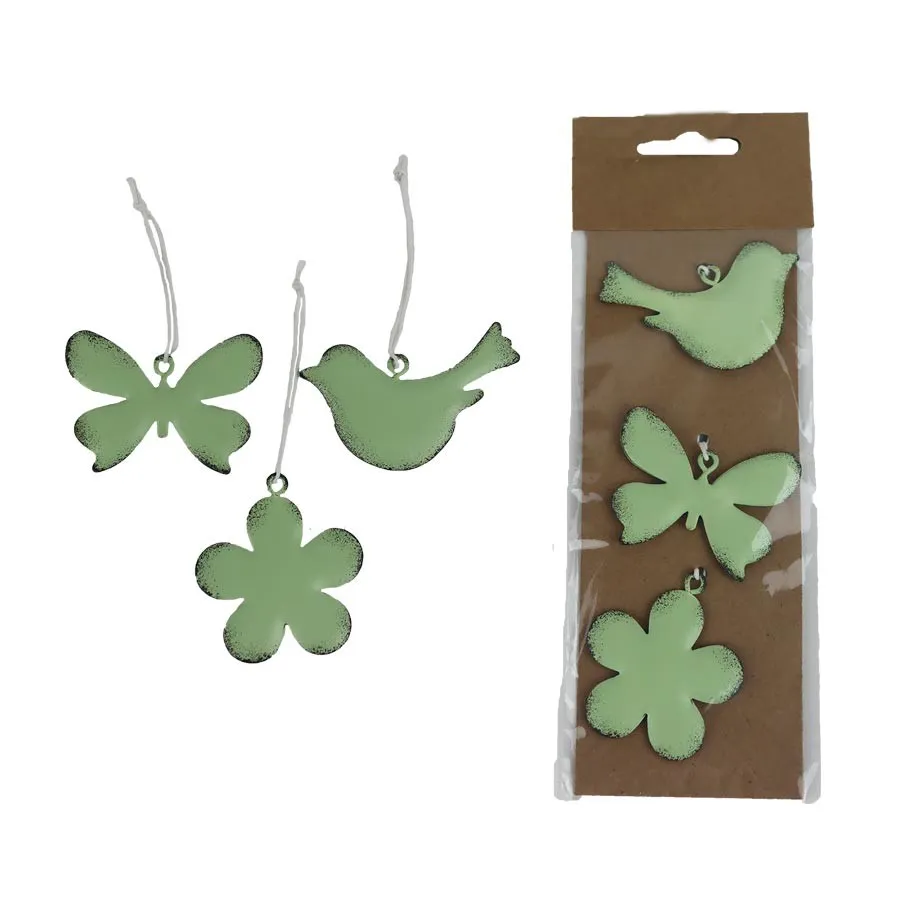 Set of decorations to hang. The set contains 3 decorations. Dimensions: 5 - 6.5 x 0.3 cm, height 4 - 5.7 cm. Color: green. Material: metal.