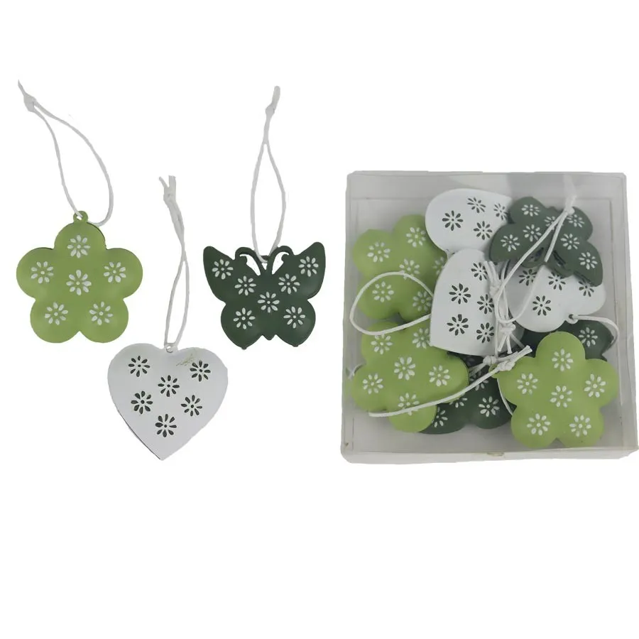 Set of decorations to hang. The set contains 9 decorations. Dimensions: 4 x 1.2 cm, height 3.2 - 4 cm. Color: combination of white, green, olive. Material: metal.