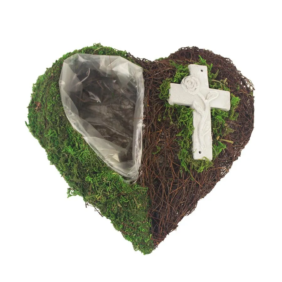 Material: rattan, moss, ceramic cross
