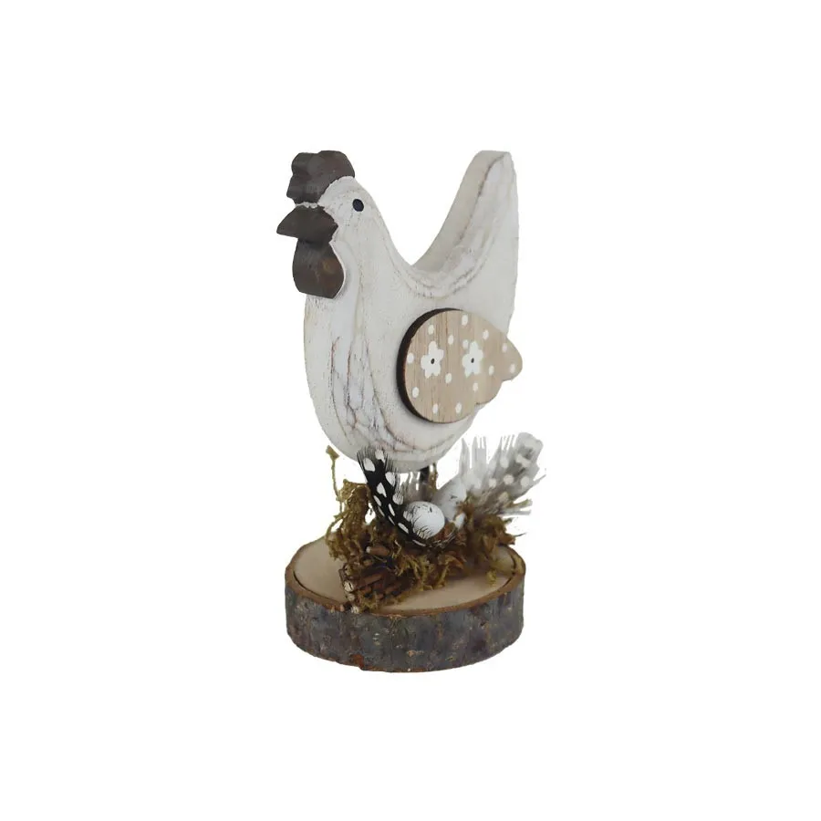 Decorative hen. Dimensions: 8.5 x 6 cm, height 12 cm. Color: combination natural, white. Wood-based material.