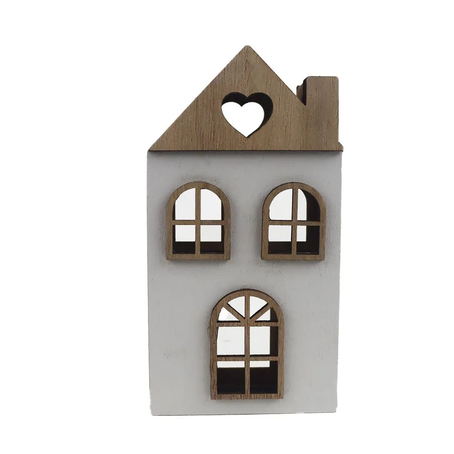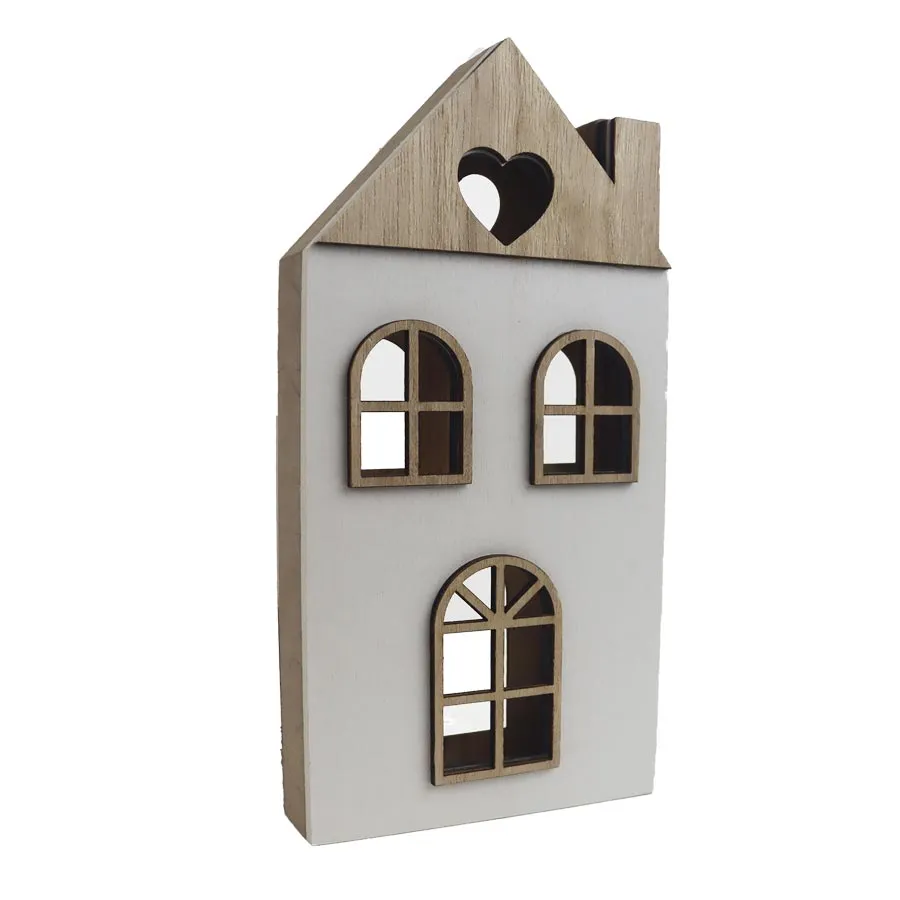 Decorative house. Dimensions: 10.5 × 3 cm, height 21 cm. Color: combination of white, natural. Wood -based material.
