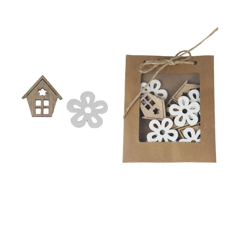 Set of decorative ornaments. The set contains 12 accessories. Dimensions: 3.3 x 0.2 cm, height 3.3 - 3.7 cm. Color: combination white, brown. Wood-based material.