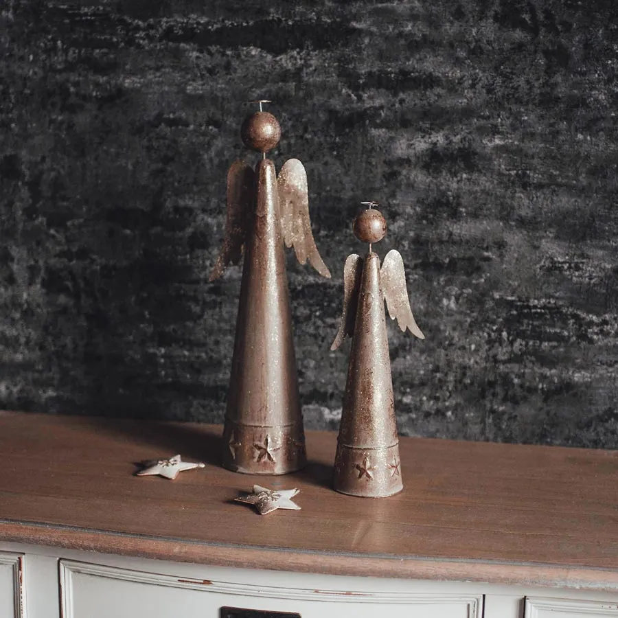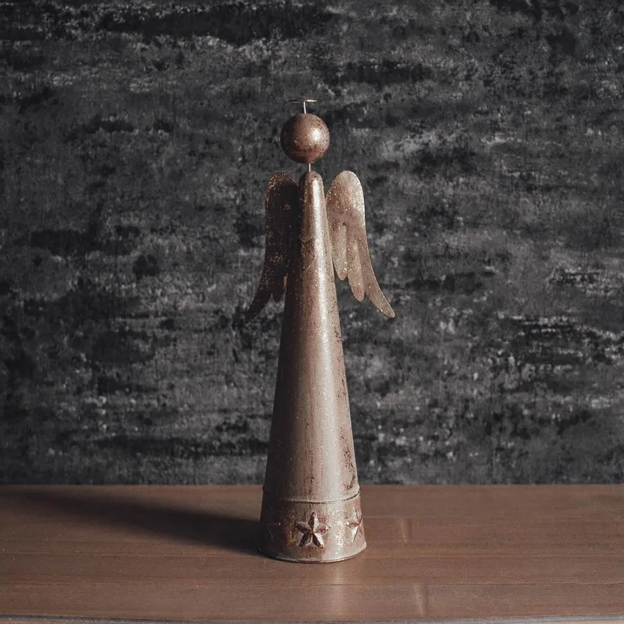 Decorative angel. Dimensions: 13.5 x 10 cm, height 39.5 cm. Color: gold. Material: metal.