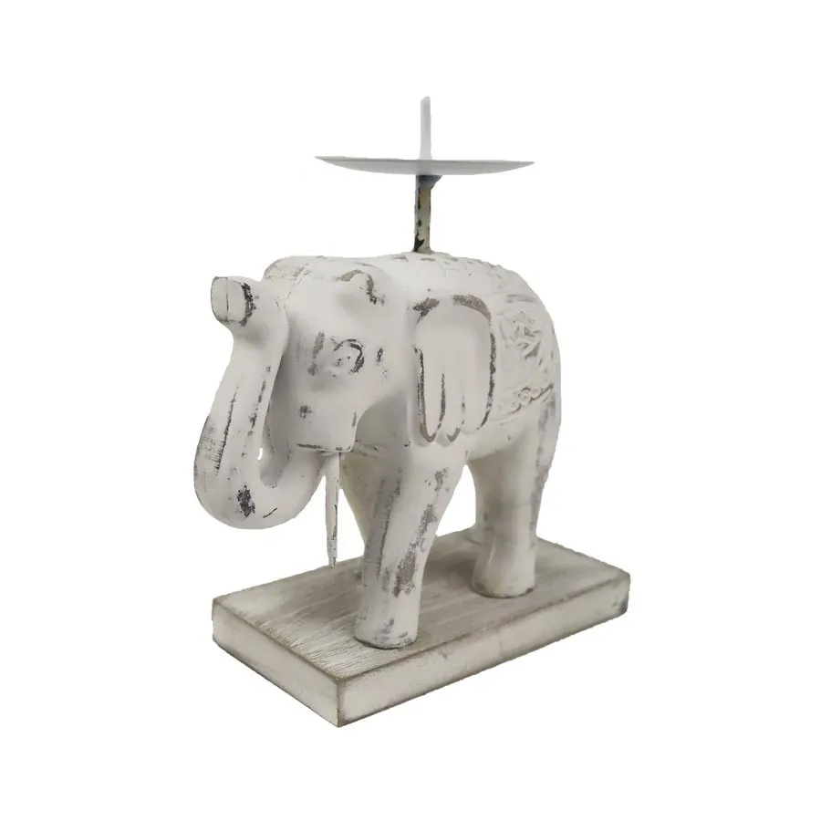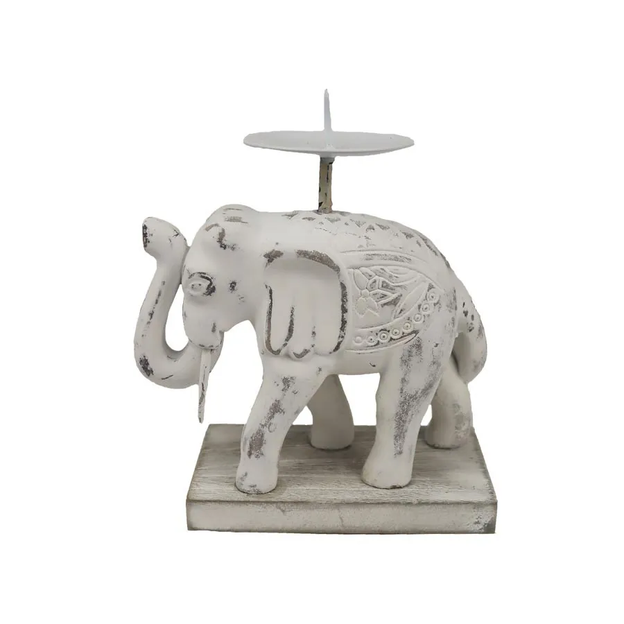 Decorative candlestick elephant. Dimensions: 15.5 × 7 cm, height 18.5 cm. Color: combination white, gray. Wood-based material, metal.