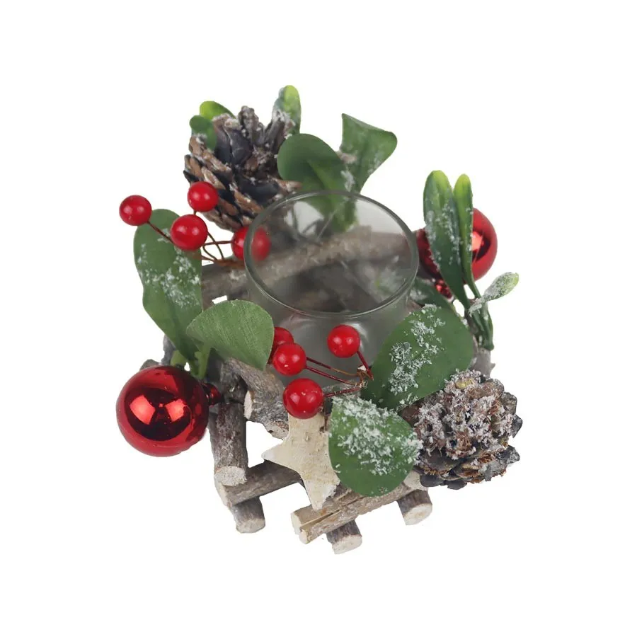 Decorative candle holder for one candle. Dimensions : diameter 14 cm, height 8 cm. Colour : combination of natural, green, red. Material : natural, plastic, glass.