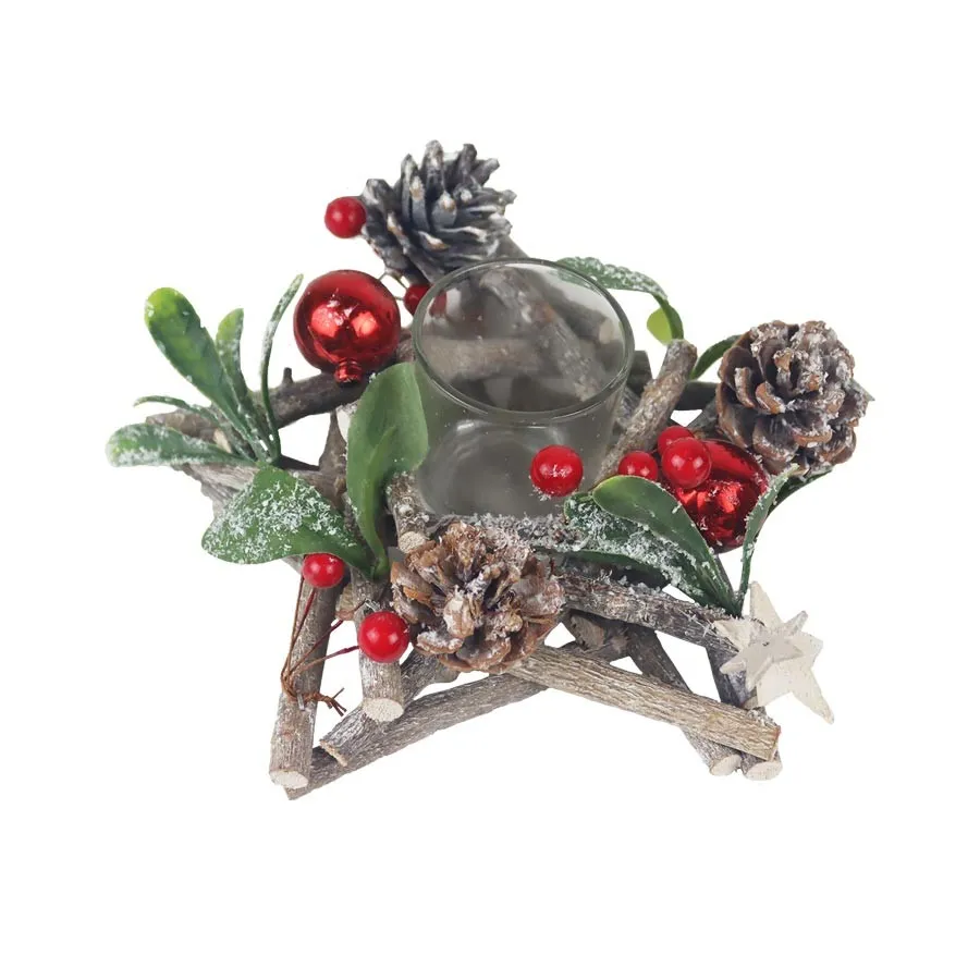 Decorative candelabra for one candle. Dimensions: diameter 20 cm, height 8 cm. Color: combination of natural, green, red, brown. Material: natural, plastic, glass.