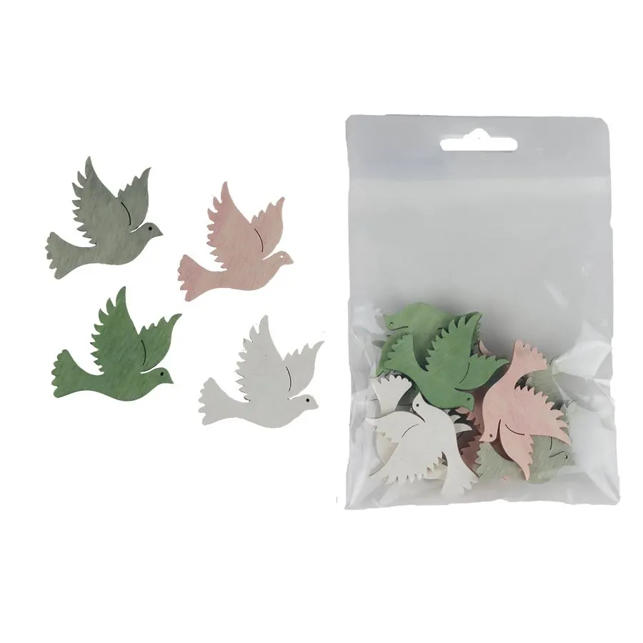 Set of decorative doves. The set contains 12 doves. Dimensions: 4 x 0.3 cm, height 3.5 cm. Color: combination of green, white, pink, gray. Wood-based material.