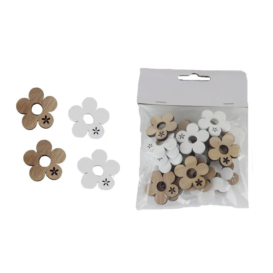 Set of decorative flowers. The set contains 24 flowers. Dimensions: diameter 2.5 cm, thickness 0.4 cm. Color: combination natural, white. Wood-based material.