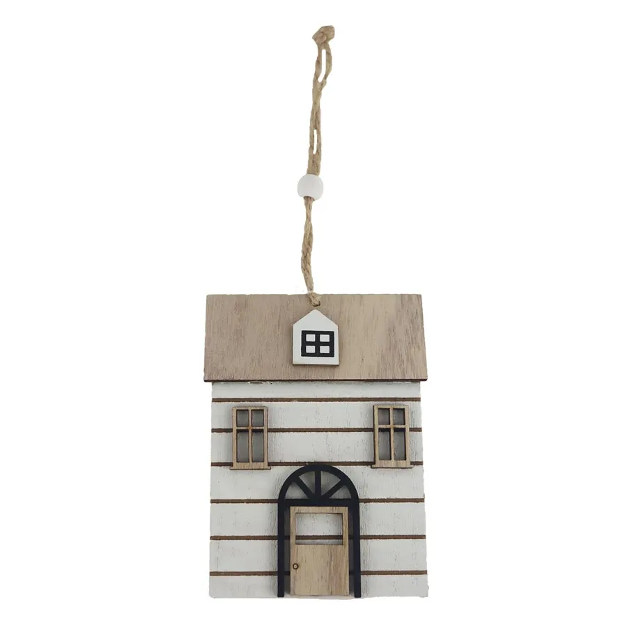 Decorative house for hanging. Dimensions: 8 × 0.9 cm, height 11 cm. Color: combination natural, white. Wood-based material.