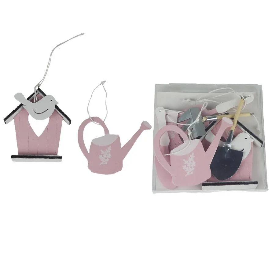 Set of decorations to hang. The set contains 7 decorations. Dimensions: 3.5 - 8 x 0.5 - 1 cm, height 6 - 10 cm. Color: combination of pink and white. Wood-based material.