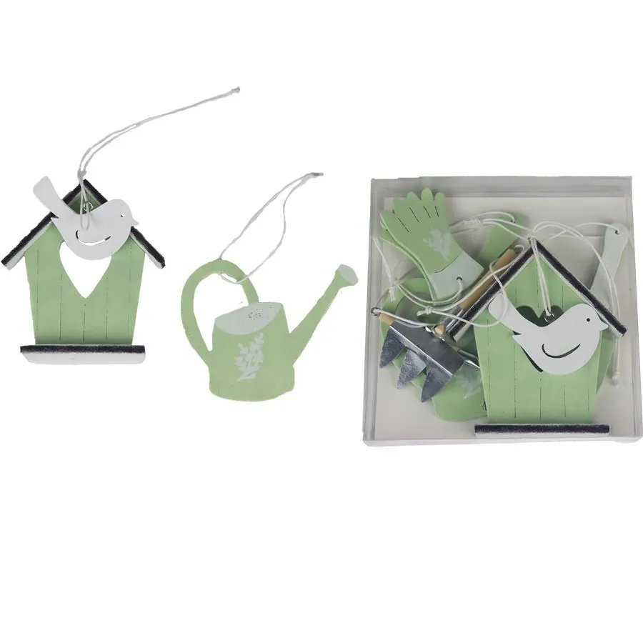 Set of decorations to hang. The set contains 7 decorations. Dimensions: 3.5 - 8 x 0.5 - 1 cm, height 6 - 10 cm. Color: a combination of green and white. Wood-based material.