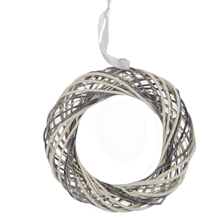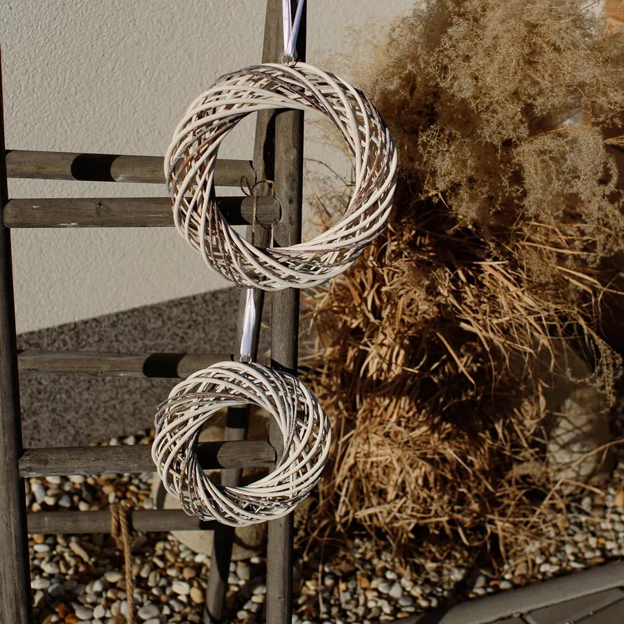 Decorative wreath. The wreath is suitable for further arranging and you can use it all year round. Dimensions: diameter 36 cm, thickness 4 cm. Color: white - gray combination. Material: wicker, wire.