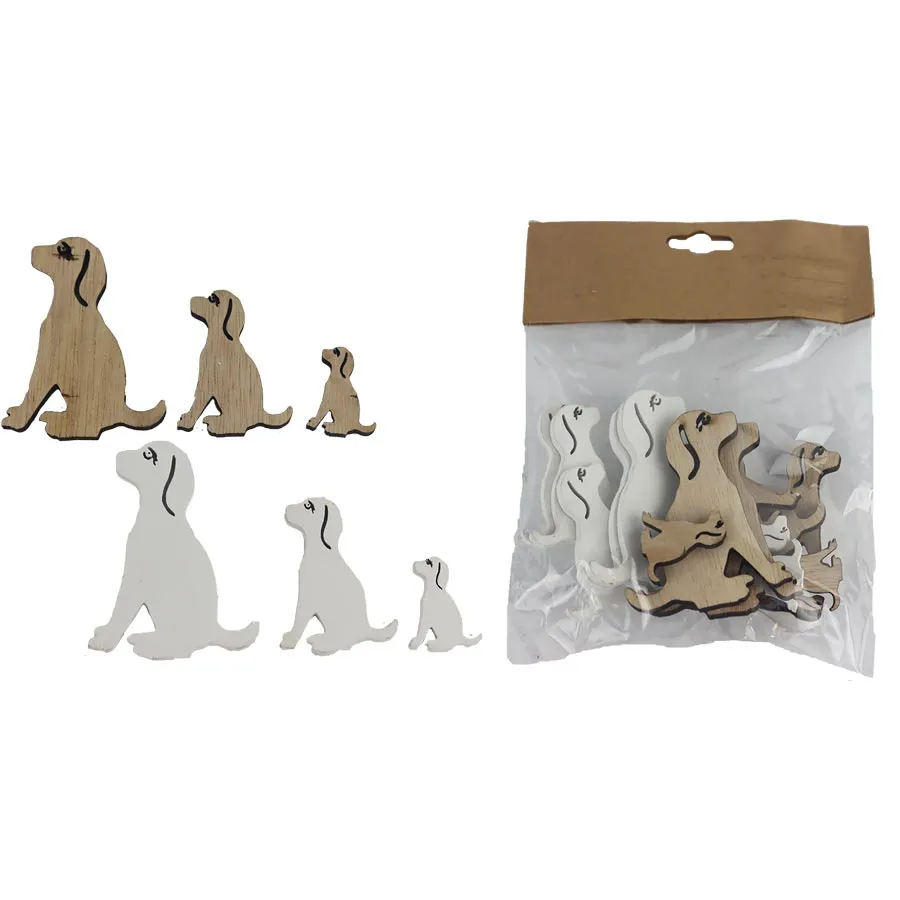 Set of decorative dogs. The set contains 18 dogs of three sizes. Dimensions: 2.3 - 5.6 x 0.5 cm, height 3 - 7 cm. Color: white, natural combination. Wood-based material.